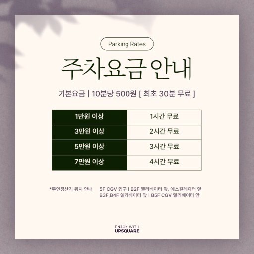 ※ 업스퀘어 카카오 플러스 친구 추가 시 무료 주차권 증정 (매주 목요일 오전 평일, 주말 주차권 자동 지급)