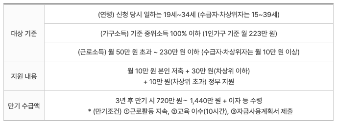 일하는 청년(기준 중위소득 50~100% 이하)이 3년간 매월 10만 원을 저축하면 정부가 월 10만 원을 지원하여, 만기 시에는 총 720만 원의 적립금(본인납입 360만 원 포함)과 이자를 수령하게 된다.