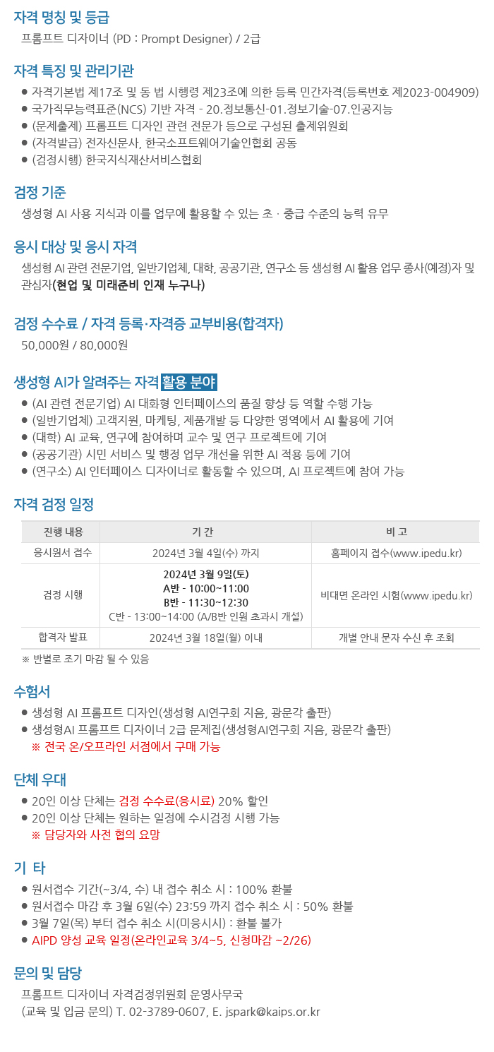 - 프롬프트 디자이너-응시 준비 및 신분증 등록, 생성형 AI활용법과 프로그래밍, 생성형 AI로 업무 생산성 향상, 비즈니스 응용의 생산성 향상